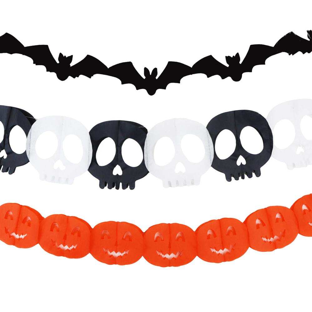 Halloween Girlander 3-pakning omfatter et sett med tre papirgirlander som har farge og form som et oransje halloweengresskar, en svart flaggermus samt svarte og hvite hodeskaller. Hver girlander sitter på en tynn, hvit snor.