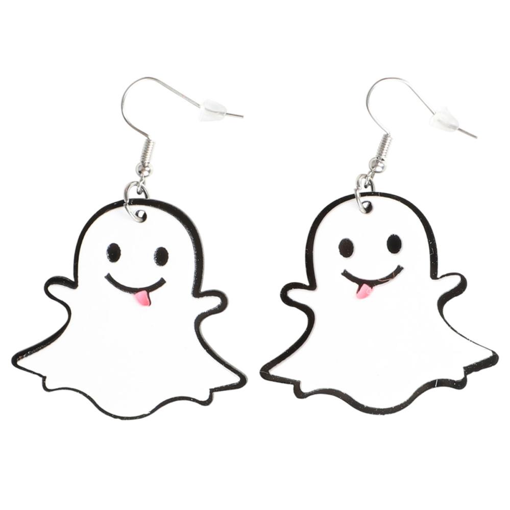 Halloween Øredobber Søte Spøkelser omfatter et par krokøredobber som forestiller smilende hvite spøkelser, komplettert med utstikkende tunger for en leken touch.