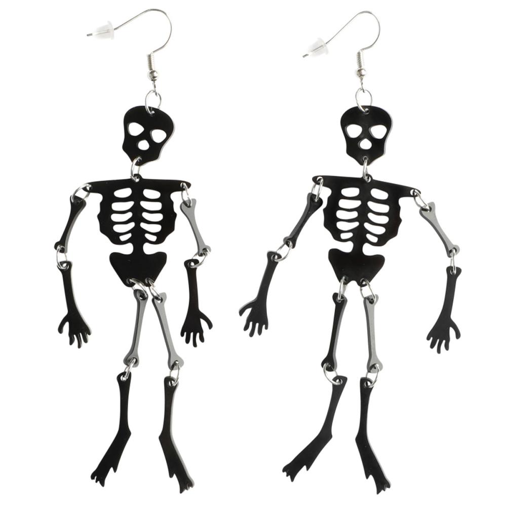 Halloween Øredobber Svarte Skjeletter omfatter et par lange krokøredobber i form av svarte skjeletter. De er laget i lett akryl som gjør dem behagelige å bære til tross for størrelsen.