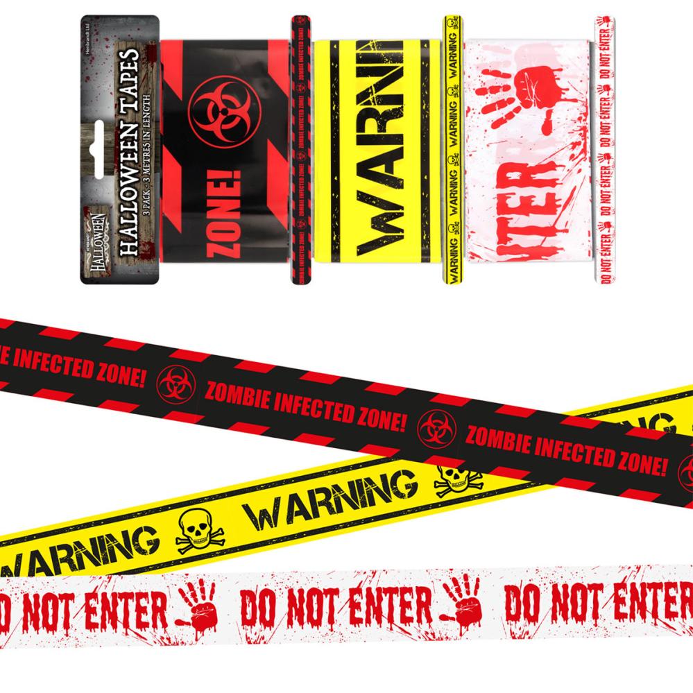 Halloween Sperrebånd 3-pakning inneholder tre sperrebånd i svart med den røde teksten ”ZOMBIE INFECTED ZONE!” og et biohazardsymbol, i gult med den svarte teksten ”WARNING” og en hodeskalle samt i hvitt med den røde teksten ”DO NOT ENTER” og en blodig hånd.