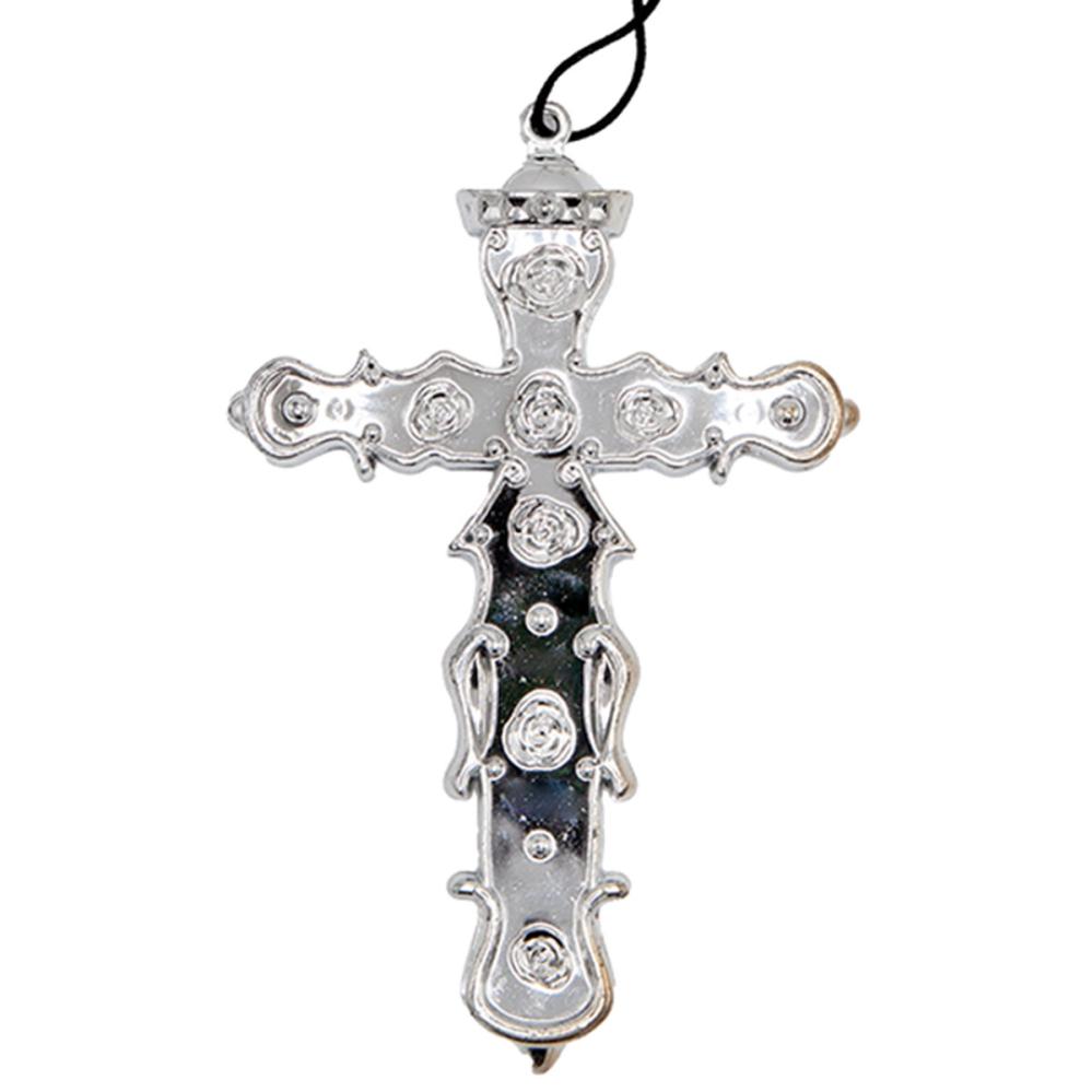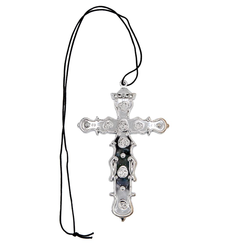 Halskjede med Sølvfarget Kors består av en svart kjede av polyester samt et metallisk sølvfarget kors dekorert med blomster og juveler.