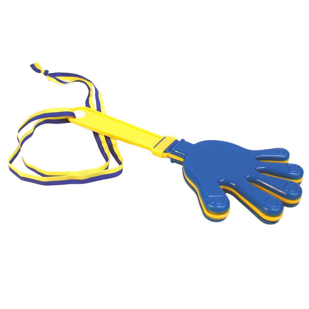 Håndklapper med Bånd Blå/Gul omfatter en håndklapper i gult og blått med et blågult bånd til å henge rundt halsen.