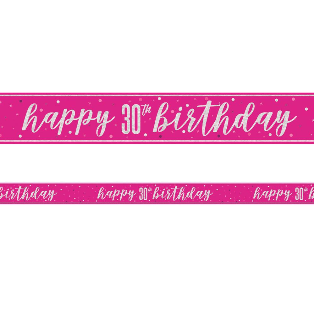 Happy 30th Birthday Girlander Cerise 2,74 m er en cerisefarget girlander med teksten ”Happy 30th Birthday” i holografisk sølv.