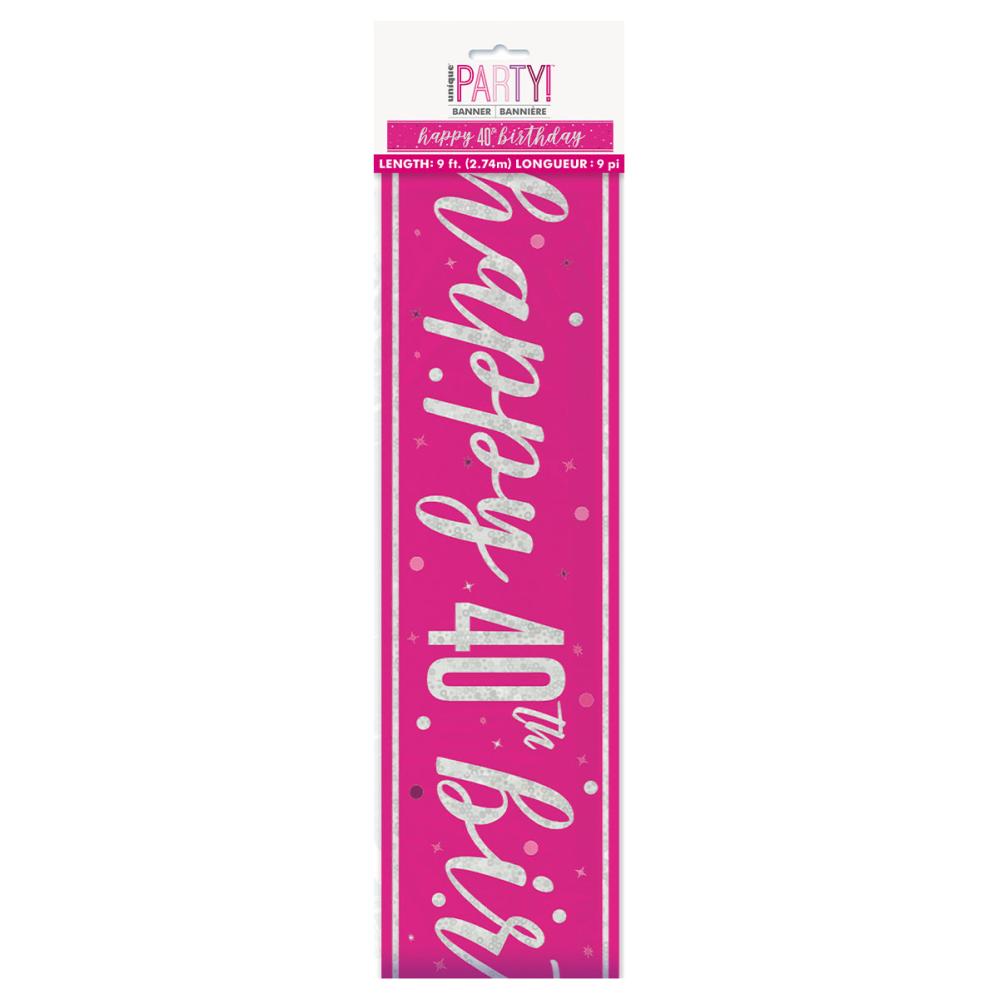 Happy 40th Birthday Girlander Cerise 2,74 m er en cerisefarget girlander med teksten ”Happy 40th Birthday” i holografisk sølv.