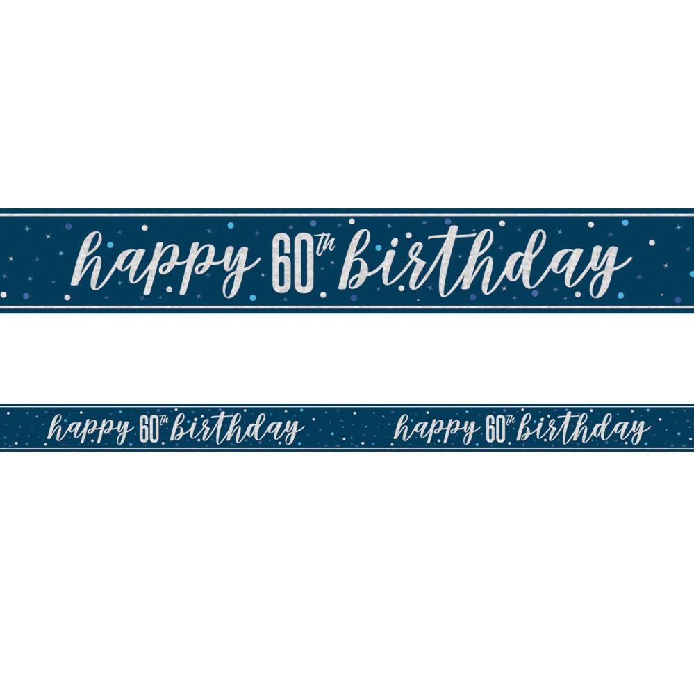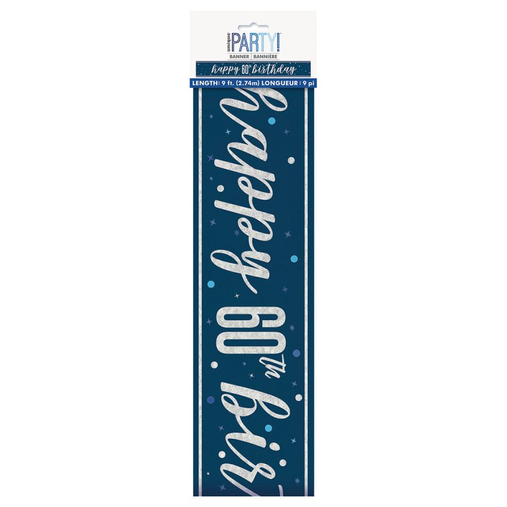 Happy 60th Birthday Banner Blå & Sølv omfatter en banner i lyseblått med prikker i hvitt, sølv og blått og holografisk sølvfarget bakside og teksten "Happy 60th birthday". Banneret er ca. 2,74 meter langt og 13 cm høyt. Laget i tynn plast.