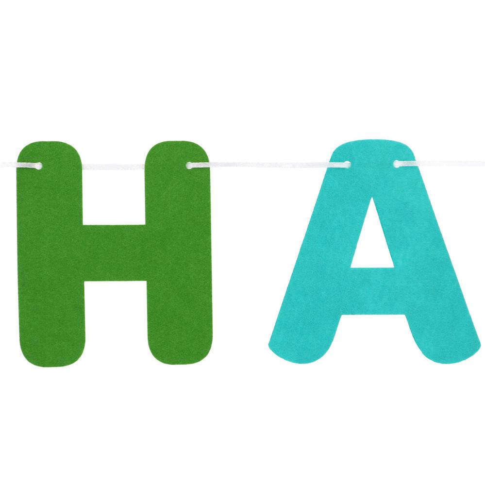 Happy Birthday Bokstavgirlander i Filt 4 m omfatter en girlander i ti ulike farger med teksten ”HAPPY BIRTHDAY”, der bokstavene er laget i et mykt filtmateriale. Girlanderen er hengt opp på et tynt, hvitt bånd.