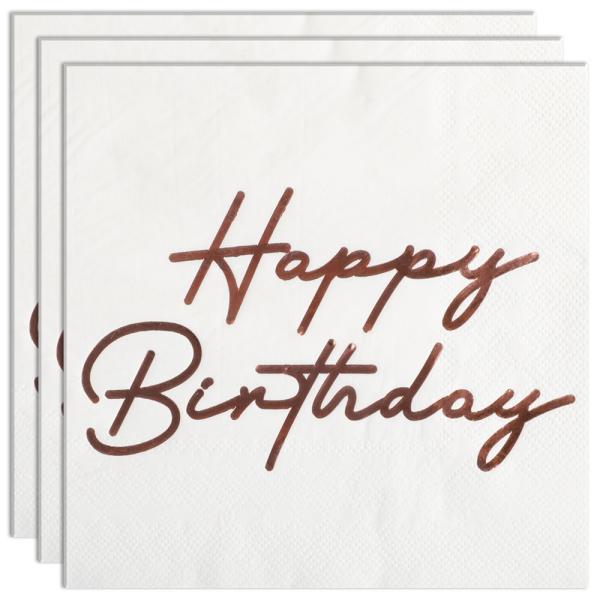 Happy Birthday Servietter Rosegull 16-pakning består av seksten hvite engangsservietter i tre lag som har teksten ”Happy Birthday” trykt i skinnende rosegull på én side, mens de øvrige sidene er helt hvite.