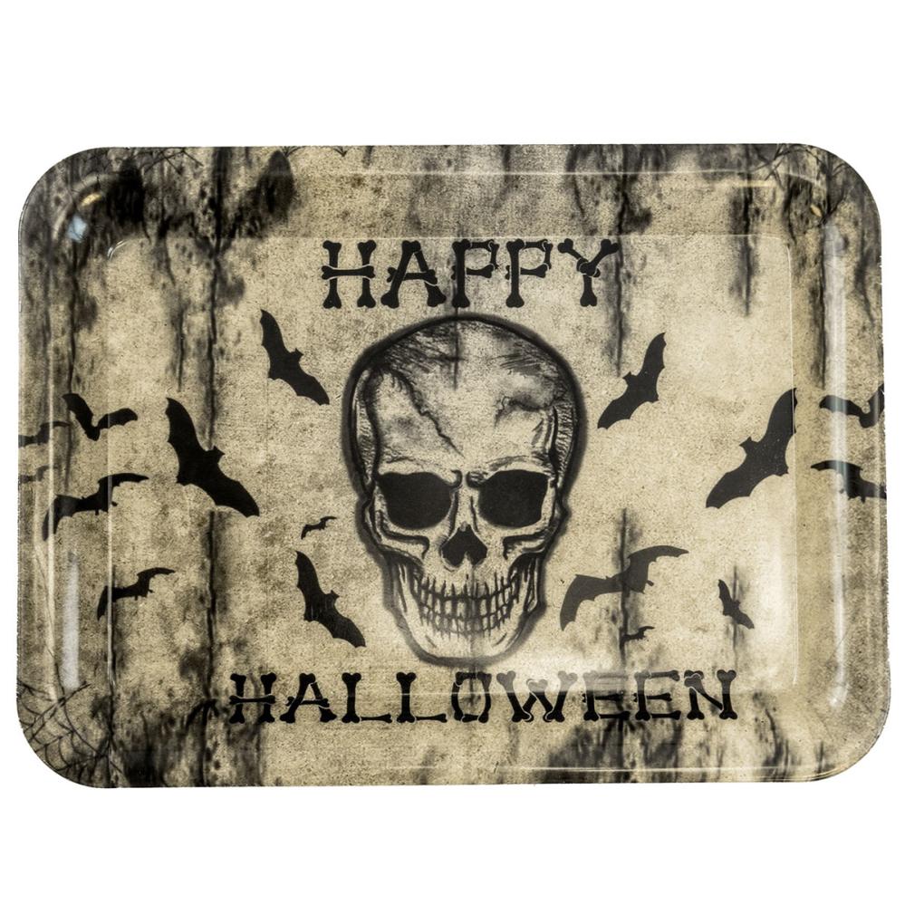 Happy Halloween Serveringsbrett er et benhvitt serveringsbrett, dekorert med en svart hodeskalle, svarte flaggermus, svarte spindelvev og teksten ”HAPPY HALLOWEEN” i svart.