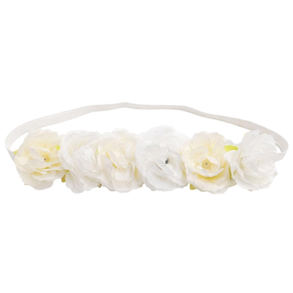 Hårbånd med Hvite Blomster består av et hvitt elastisk hårbånd dekorert med seks hvite blomster og grønne blader, hvorav tre av blomstene har diskrete gule detaljer.