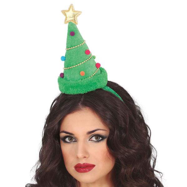 Hårbøyle Juletre omfatter en tekstilkledd hårbøyle i grønt med et oppstikkende mykt juletre fylt med bomull. Treet er dekorert med små fargerike kuler, en gyllen glittergirlang og en skinnende gullstjerne på toppen.