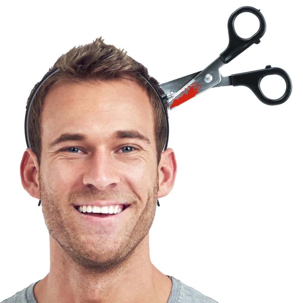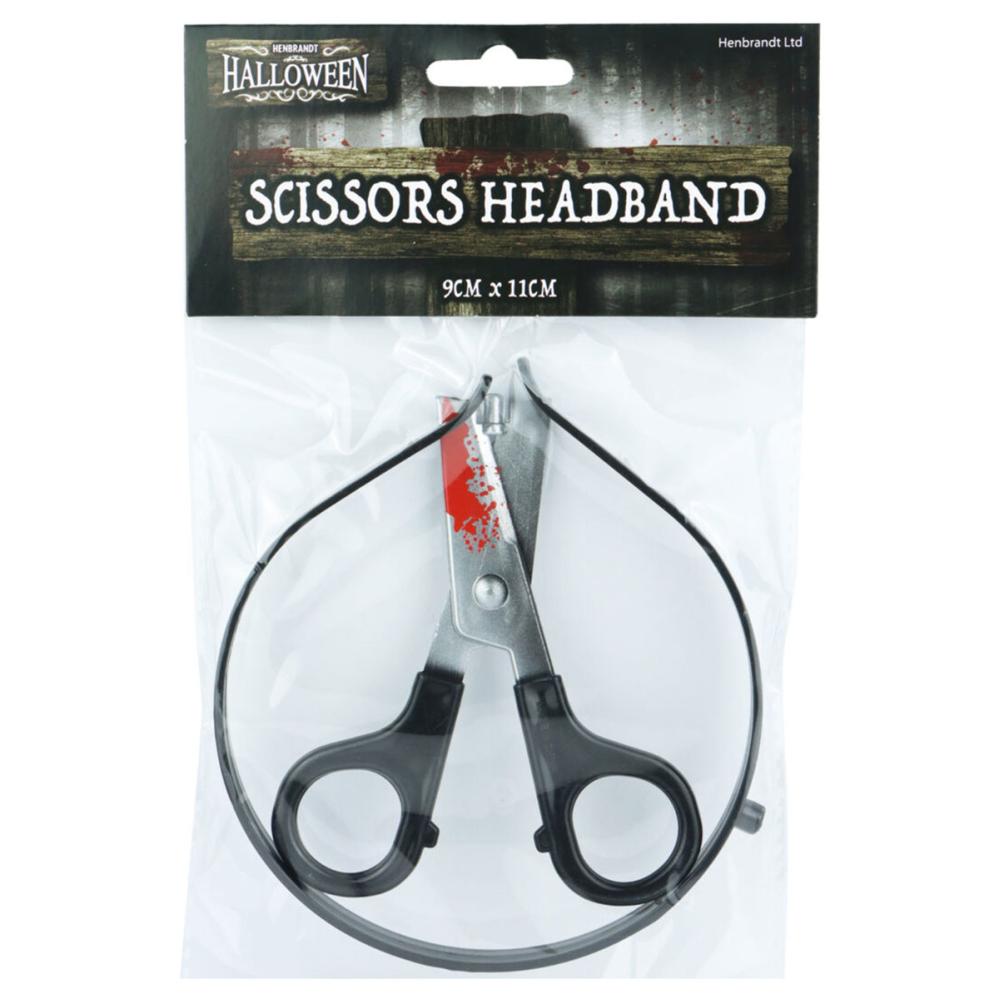 Hårbøyle med Blodig Saks omfatter en svart hårbøyle med en avtakbar utstikkende saks som har et blodig sølvfarget blad og et svart håndtak.
