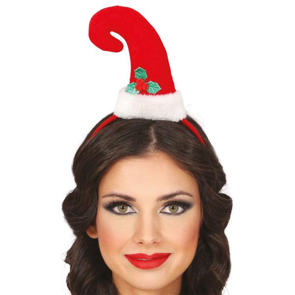 Hårbøyle med Nisselue omfatter en rød, stofftrukket hårbøyle med en liten rød-hvit nisselue på toppen, dekorert med en julerakle på forsiden.