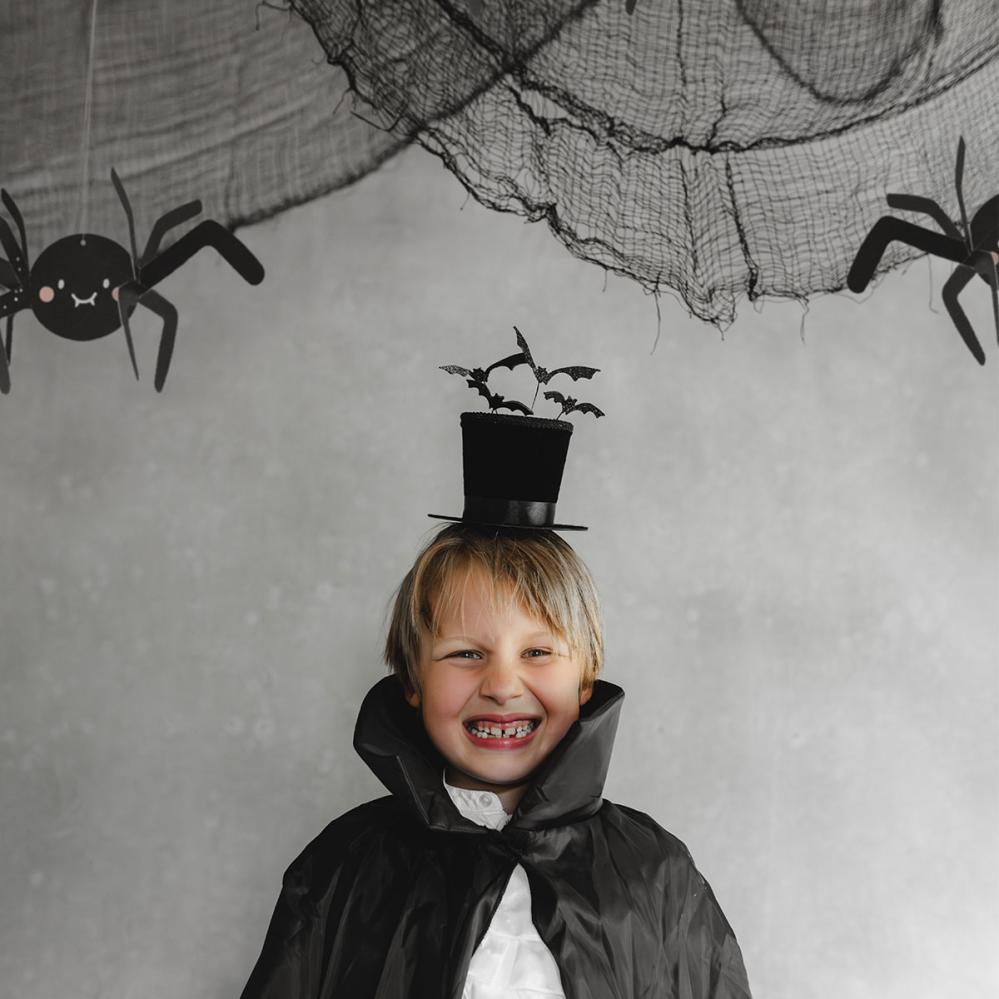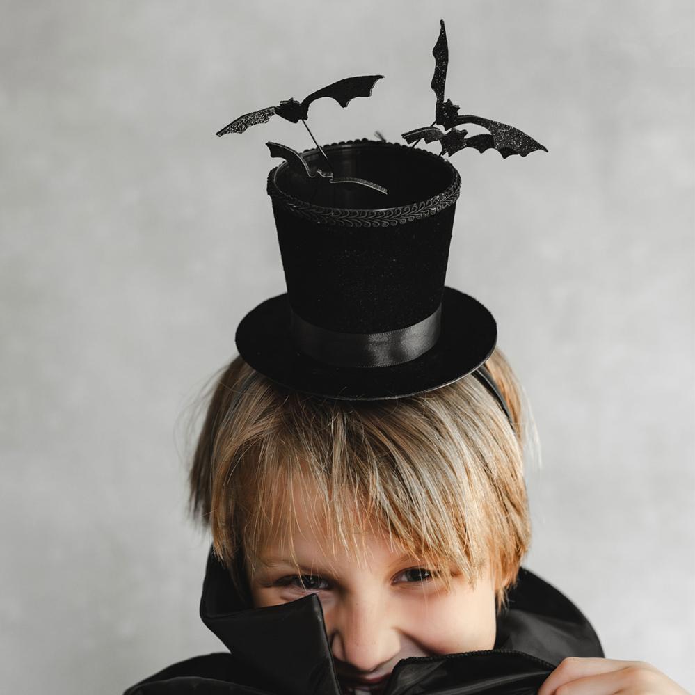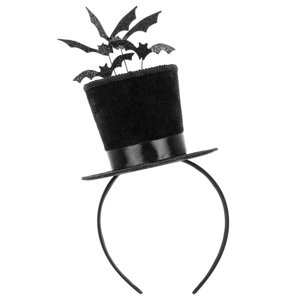 Hårbøyle med Sylinderhatt & Flaggermus omfatter en svart hårbøyle med en utstikkende sylinderhatt som er dekorert med utstikkende flaggermus.