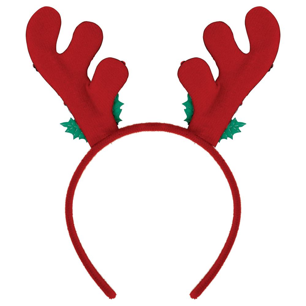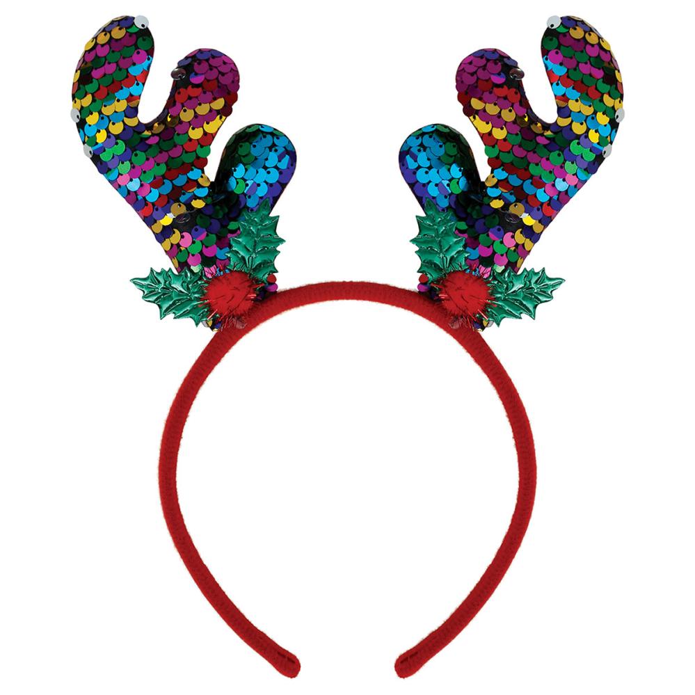 Hårbøyle Reinsdyrhorn med Paljetter omfatter en rød, stoffkledd hårbøyle med reinsdyrhorn som er dekorert med fargerike paljetter på forsiden samt en julemister under hvert horn. Reinsdyrhornene står stødig takket være en metallspiral som sitter i hvert av dem.