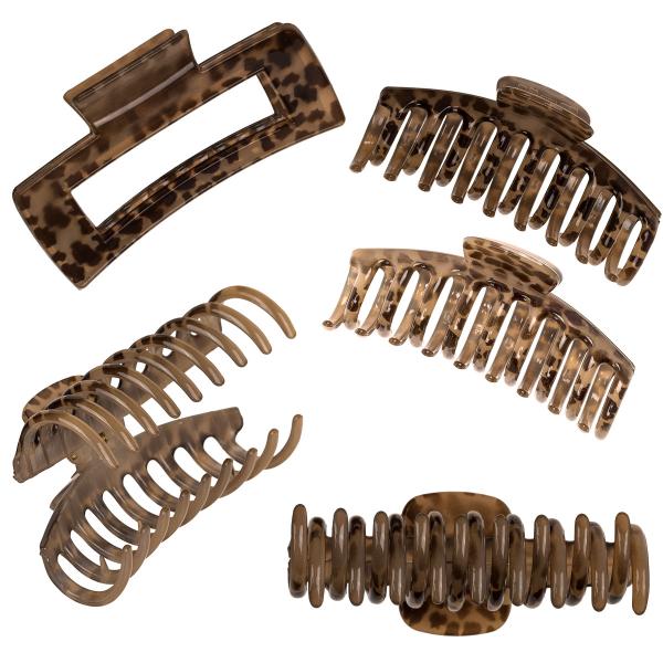 Hårklyper med Leopardmønster 11 cm 2-pakning består av et sett med to leopardmønstrede hårklyper, hvorav den ene har en rektangulær form. Settet finnes i to ulike fargevarianter: en i brun tone og en i beige tone.