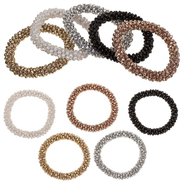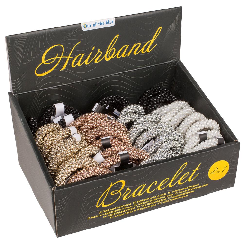 Hårstrikk med Skimrende Perler består av et elastisk bånd som er dekorert med små, glinsende perler og kan også brukes som et armbånd. Hårstrikken finnes i fem ulike farger: svart, hvit, roségull, gull og sølv.