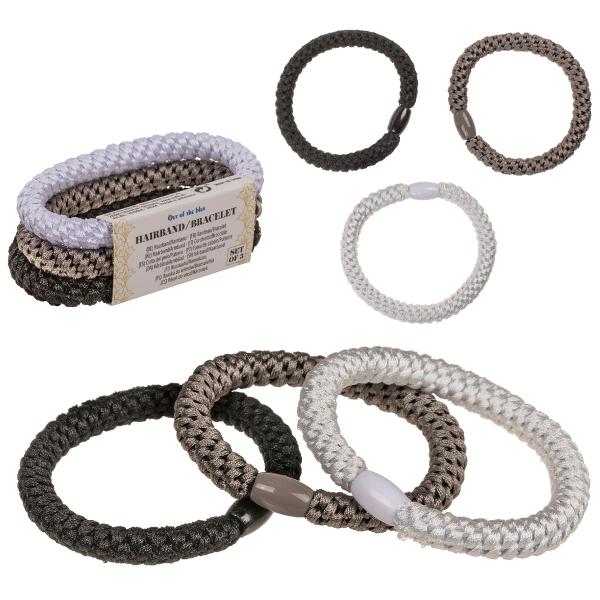 Hårstrikker Svart/Grå/Hvit 3-pakning består av tre slitesterke hårstrikker i fargene svart, grå og hvit med et vevd mønster og en dekorativ detalj i midten. De kan også brukes som stilrene armbånd.