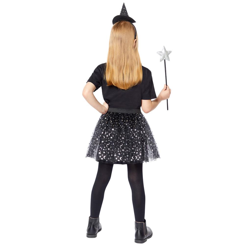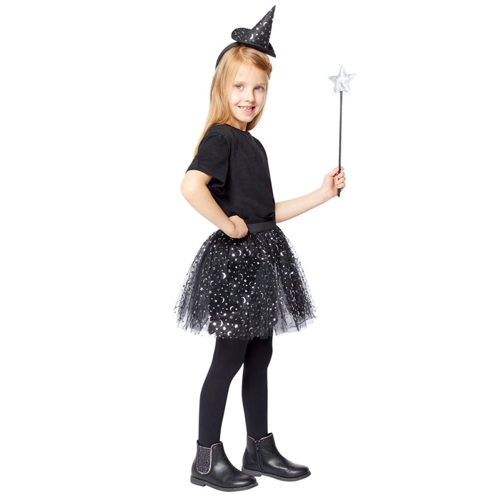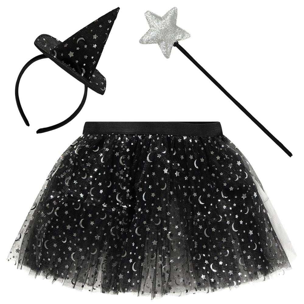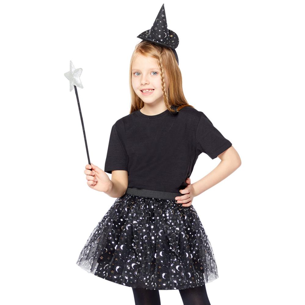 Heks Tilbehørssett med Stjerner Barn omfatter et sett med tilbehør for å kle deg ut som en søt heks. Settet inneholder en tryllestav med en skimrende sølvstjerne på toppen, et svart tyllskjørt og et diadem med en liten svart heksehatt. Både skjørtet og hatten er dekorert med sølvfargede måner og stjerner.