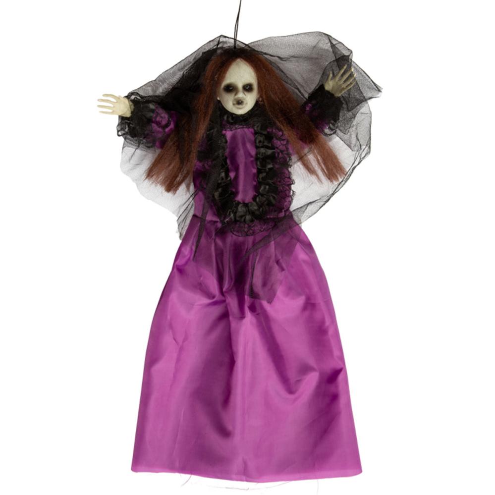 Hengende Dukke 55 cm omfatter en hengende dekorasjon i form av en skummel dukke med brunt hår, iført en lilla og svart kjole samt et svart slør.