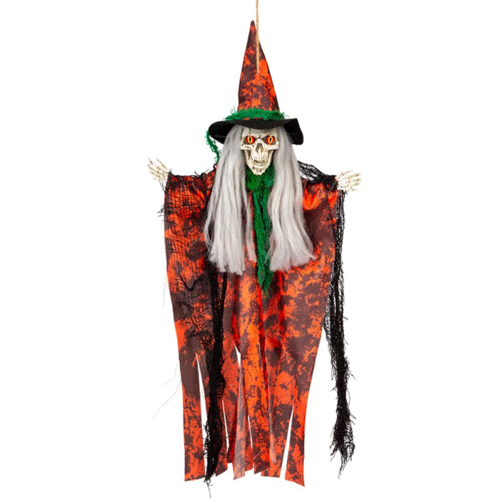 Hengende Heks 60 cm omfatter en hengende dekorasjon med en heks i skjelettform som har lysgrått hår og er kledd i en oransje og svart drakt og matchende heksehatt.