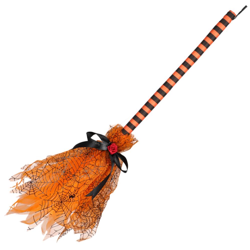 Hengende Heksekost omfatter en hengende halloweendekorasjon i form av en oransje og svart heksekost, utstyrt med en hempe for enkel opphenging. Kosten har et stripete skaft, oransje nettingstoff med svart edderkoppmotiv samt et svart bånd med rød rose. OBS! Produktet er kun ment som dekorasjon og bør ikke brukes som leke.