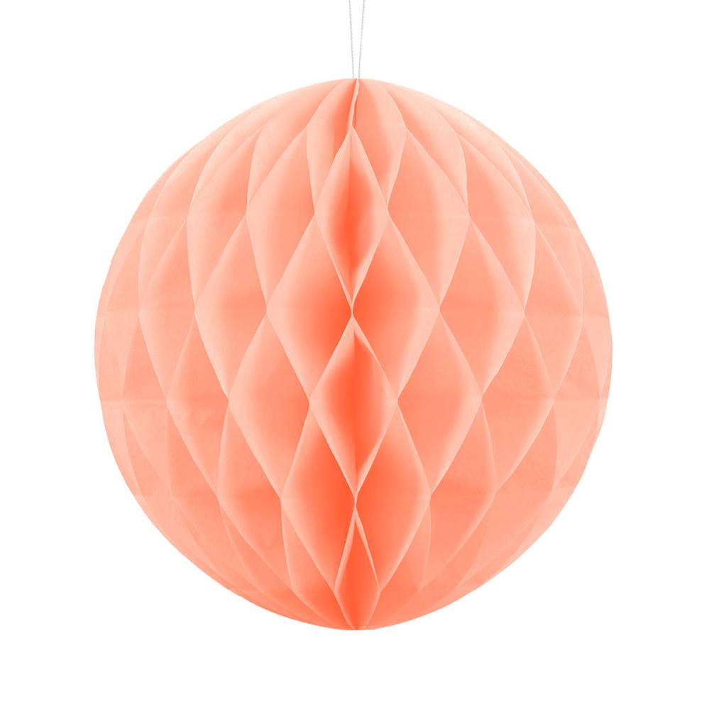 Hengende Honeycomb Lys Fersken 30 cm omfatter en kuleformet honeycomb i lys ferskenfarge med klemmer for enkel montering og et hvitt snøre for oppheng.