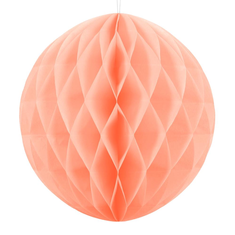 Hengende Honeycomb Lys Fersken 40 cm omfatter en kuleformet honeycomb i lys ferskenfarge med klemmer for enkel montering og en hvit snor for oppheng.