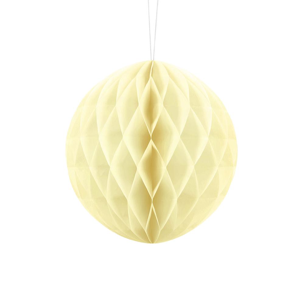 Hengende Honeycomb Strågul 20 cm omfatter en kuleformet honeycomb i strågult med klemmer for enkel montering og en hvit snor for oppheng.