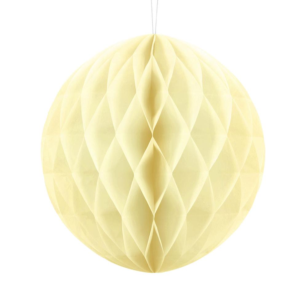 Hengende Honeycomb Strågul 30 cm omfatter en kuleformet honeycomb i strågult med klemmer for enkel montering og en hvit snor for oppheng.