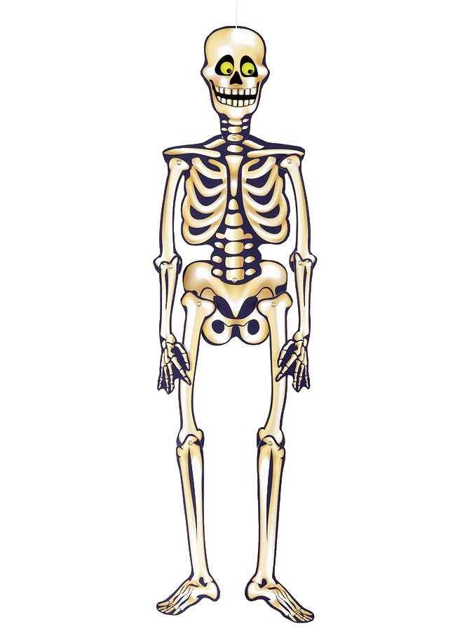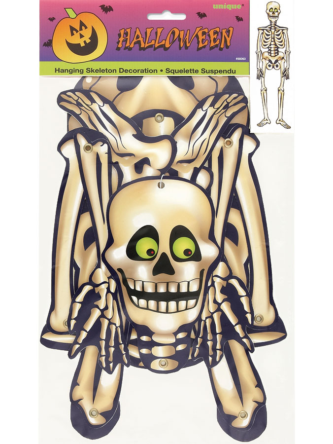 Hengende Skjelett Dekorasjon er laget av pappmateriale og omfatter en hengende dekorasjon i form av et skjelett med bevegelige ledd. Du henger enkelt opp skjelettet ved hjelp av inkludert hvit opphengsanordning.