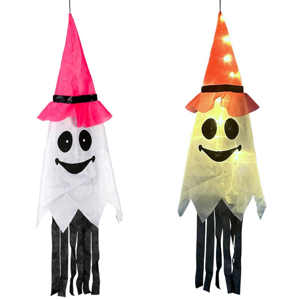 Hengende Spøkelse med LED-lys 100 cm omfatter en hengende dekorasjon i form av et hvitt spøkelse med rosa heksehatt og svarte stoffstrimler som henger ned for en spøkelsesaktig effekt. Når dekorasjonen aktiveres lyser flere innebygde LED-lamper opp figuren og skaper en stemningsfull belysning.