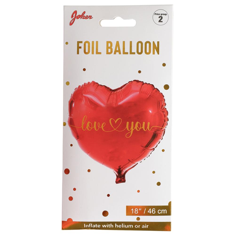 Hjerte Folieballong I Love You 46 cm er en folieballong formet som et rødt hjerte med teksten ”Love you” i skimrende gullfarge. Ballongen fylles med luft med det medfølgende blåserøret eller med helium og har løkker for enkel oppheng med den hvite snoren som følger med.