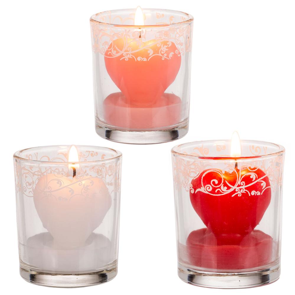 Hjertelys i Dekorativt Glass omfatter et hjerteformet lys i et glass med et hvitt, dekorativt mønster øverst. Lyset finnes i fargene rød, rosa og hvit, men det selges usortert og enkeltvis, så det blir en overraskelse hvilken farge du får.