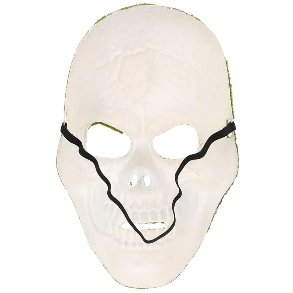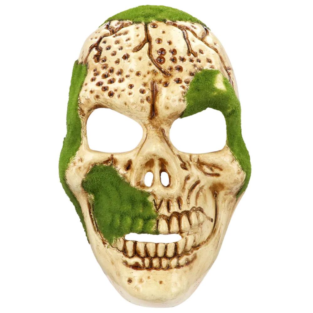 Hodeskalle Maske Natur omfatter en maske som forestiller en beige hodeskalle som har blitt overgrodd av naturen og har sprekker, smuss og grønn mose. Masken holdes på plass med et svart elastisk bånd.