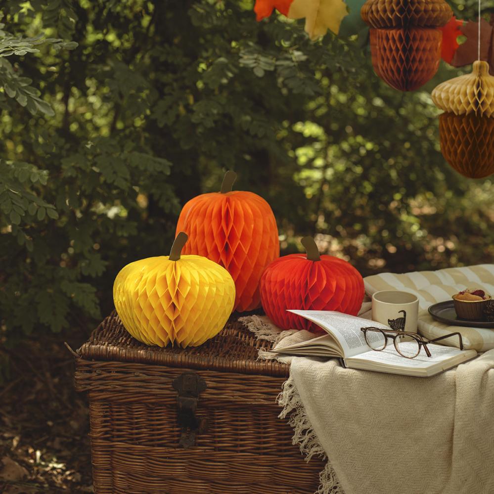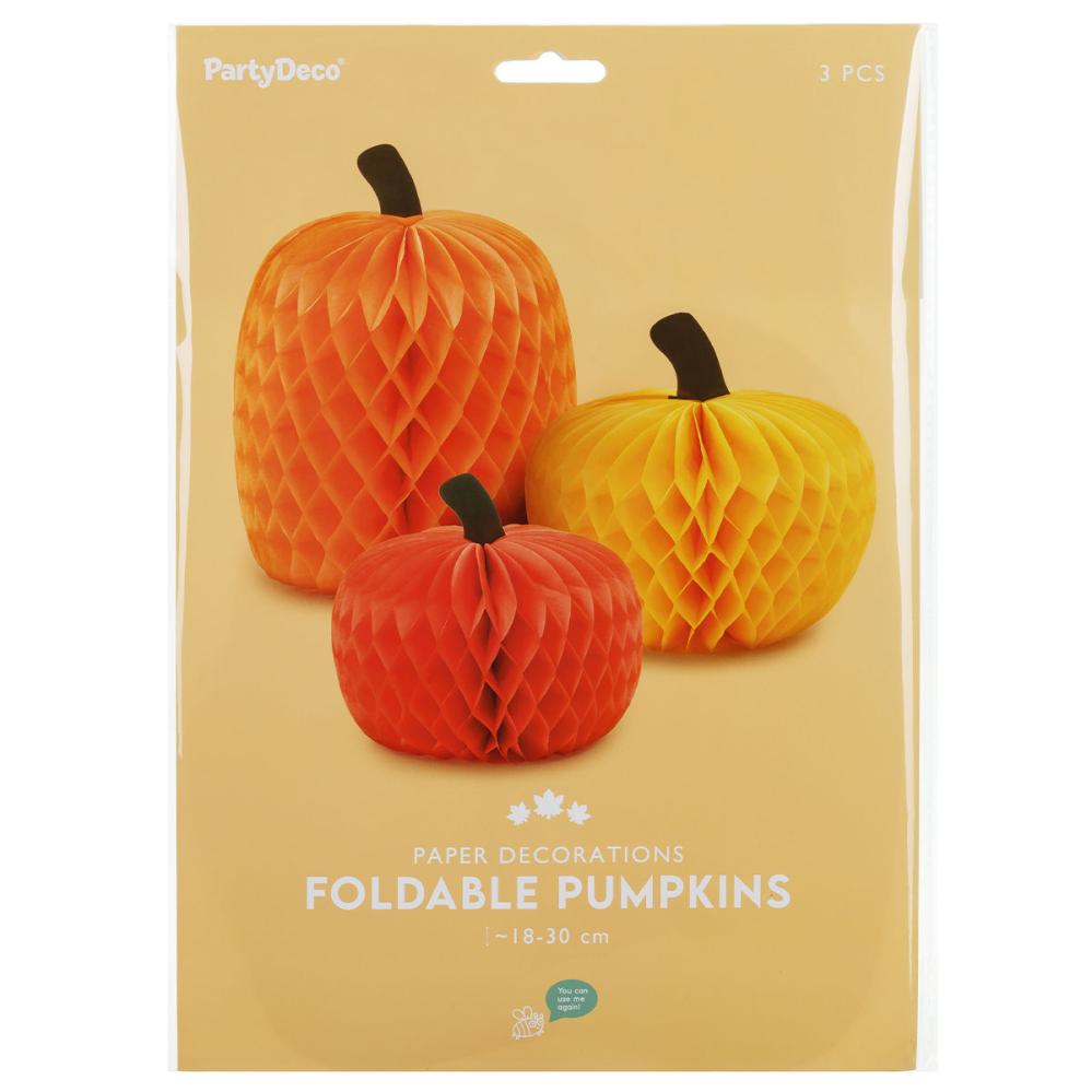 Honeycomb Gresskar 3-pakning inneholder tre honeycombs som forestiller gresskar i nyanser av oransje og gul med hvite klemmer for enkel montering.