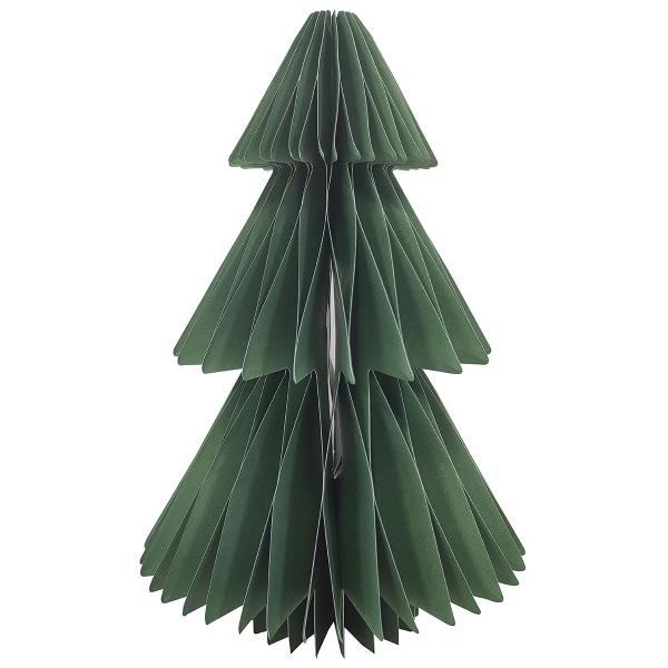 Pappkonstruksjonen i honeycomb-utførelse brettes ut til et diskret juletre som kan settes på bord eller i vindu. Det er en juledekorasjon som kan brettes sammen for oppbevaring og tas frem igjen neste år.