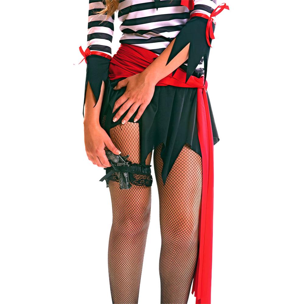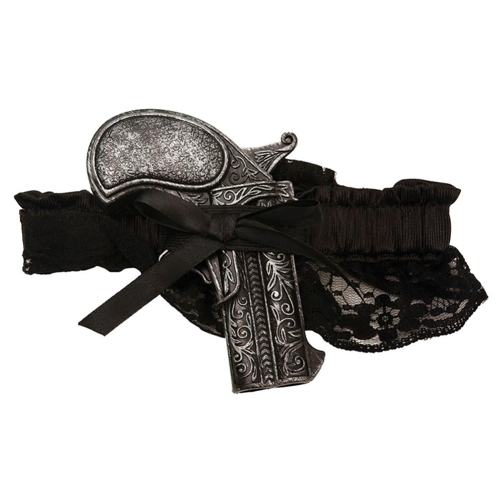 Skjul våpenet ditt elegant under skjørtet og vær alltid klar for revolverduell med dette kule hosebåndet med pistol! Med denne lekepistolen kan du enkelt sette prikken over i-en på din gangsterutkledning. Tøft maskeradetilbehør som passer perfekt til enhver gangsterjente!