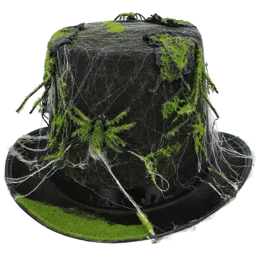 Denne kostymehatten til Halloween er en svart høy hatt med uhyggelige detaljer som spindelvev, mose og små edderkopper. Perfekt for deg som vil gi en skremmende vri på utkledningen din.