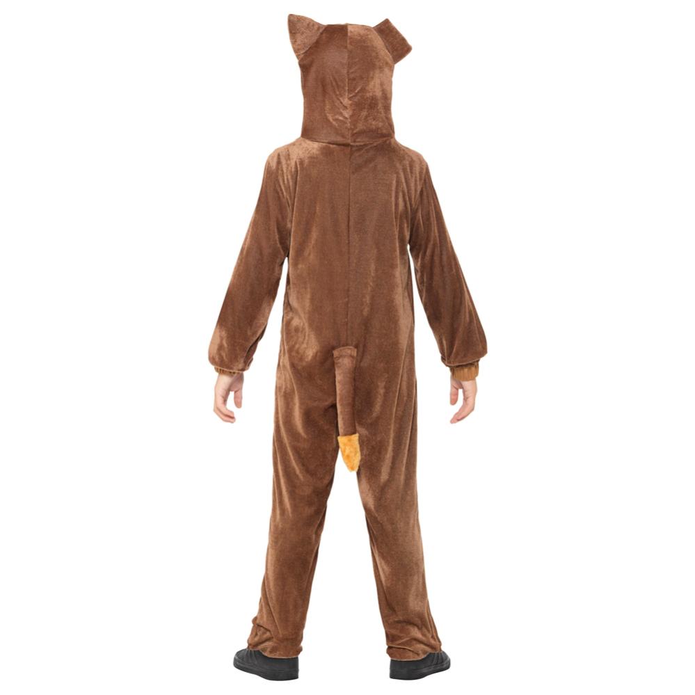 Hund Kostyme Barn inkluderer en hundedrakt for barn med pels, hette og hale. Pelsen er brun og oransje på magen, halespissen og ansiktet, hetten har ører, øyne, nese og munn.