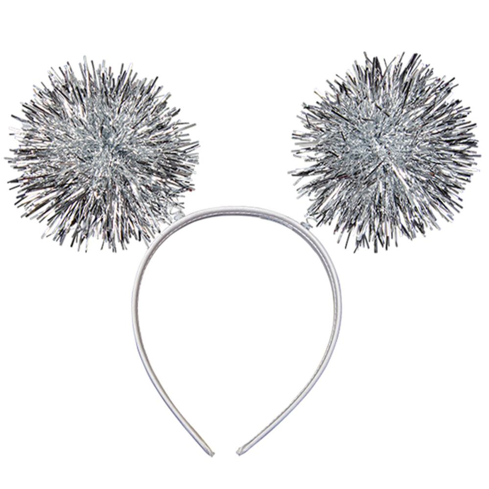 Hvit Hårbøyle med Sølvfargede Pom Poms omfatter en hvit hårbøyle med to utstikkende pom poms av sølvfarget folie.