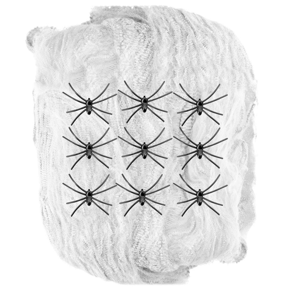 Hvitt Spindelvev med Edderkopper 200g omfatter 200 gram hvitt spindelvev av polyester med ni svarte plastedderkopper.