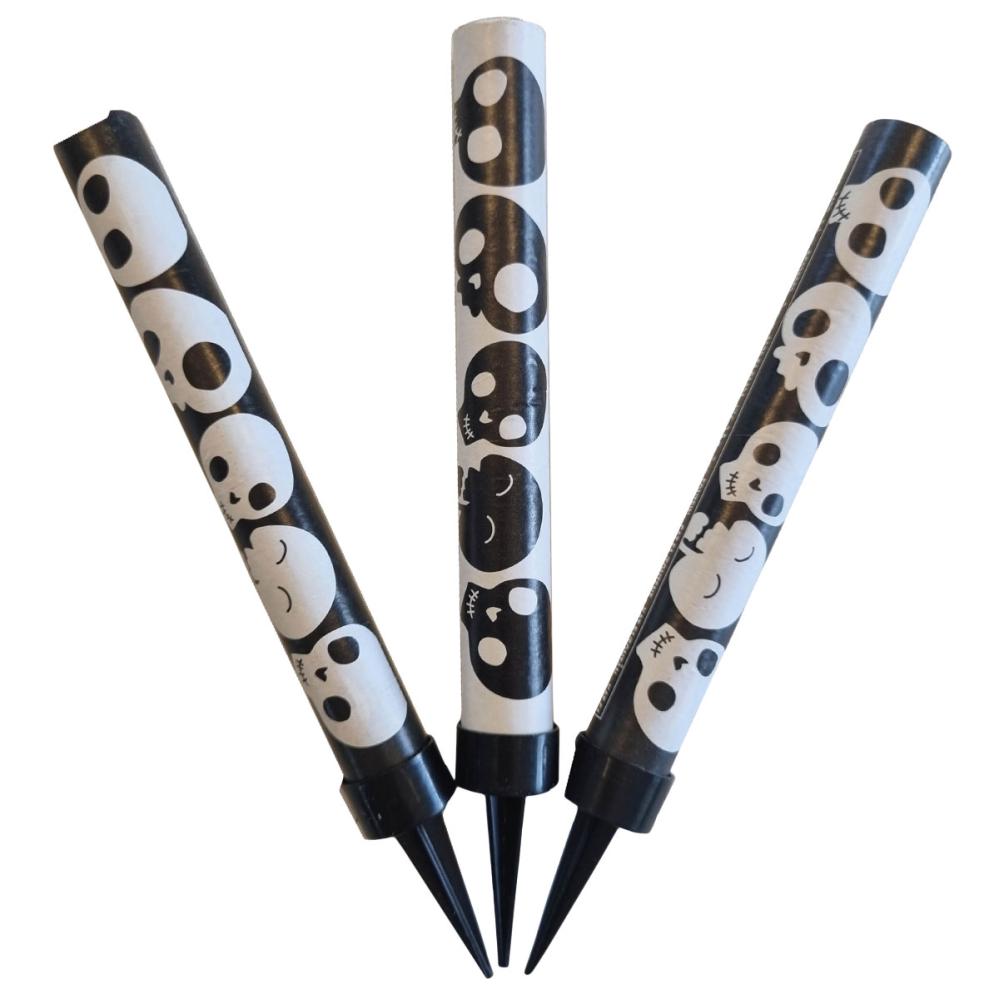 Isfakler Halloween 3-pakning består av tre isfakler i svart og hvitt, dekorert med hodeskaller.