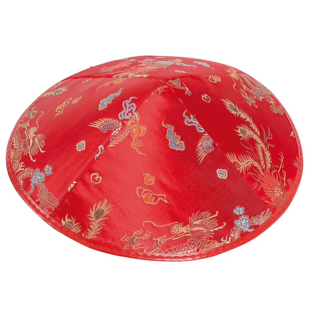 Japansk Hatt Röd omfatter en rød japansk hatt som er dekorert med drager og planter. Hatten festes på hodet med et svart elastisk bånd under haken.