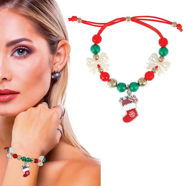 Julearmbånd Julestrømpe omfatter et armbånd med en justerbar rød snor, dekorert med runde perler i rødt, grønt og gull samt to hvite sløyfer. Armbåndet prydes dessuten av en dinglende berlok med motiv av en glitrende julestrømpe med Rudolf og en sukkertøystang inni.