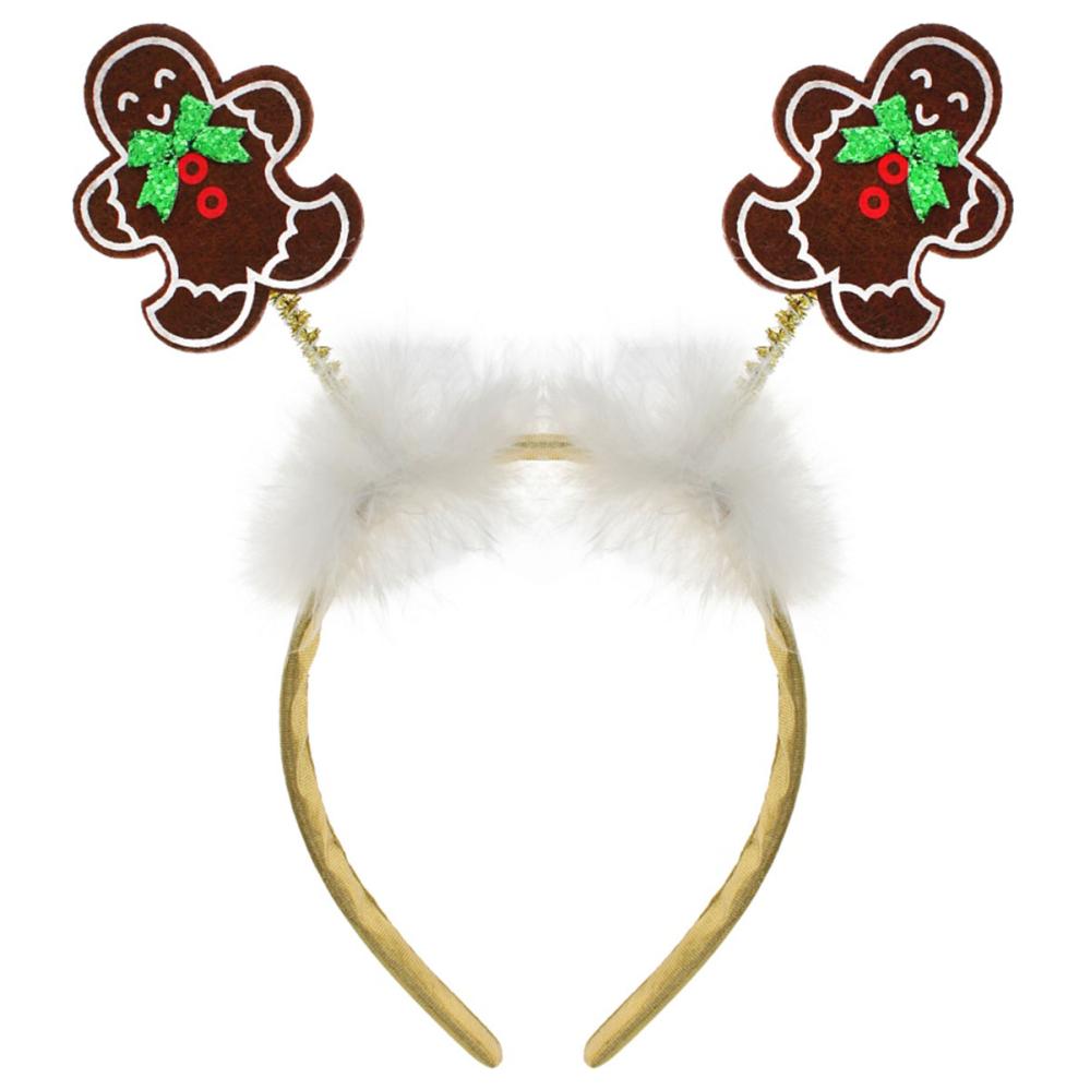 Julehårbøyle med Pepperkakemenn omfatter et gullfarget hårbøyle med hvitt fluff og utstikkende brune pepperkakemenn med julemønster.