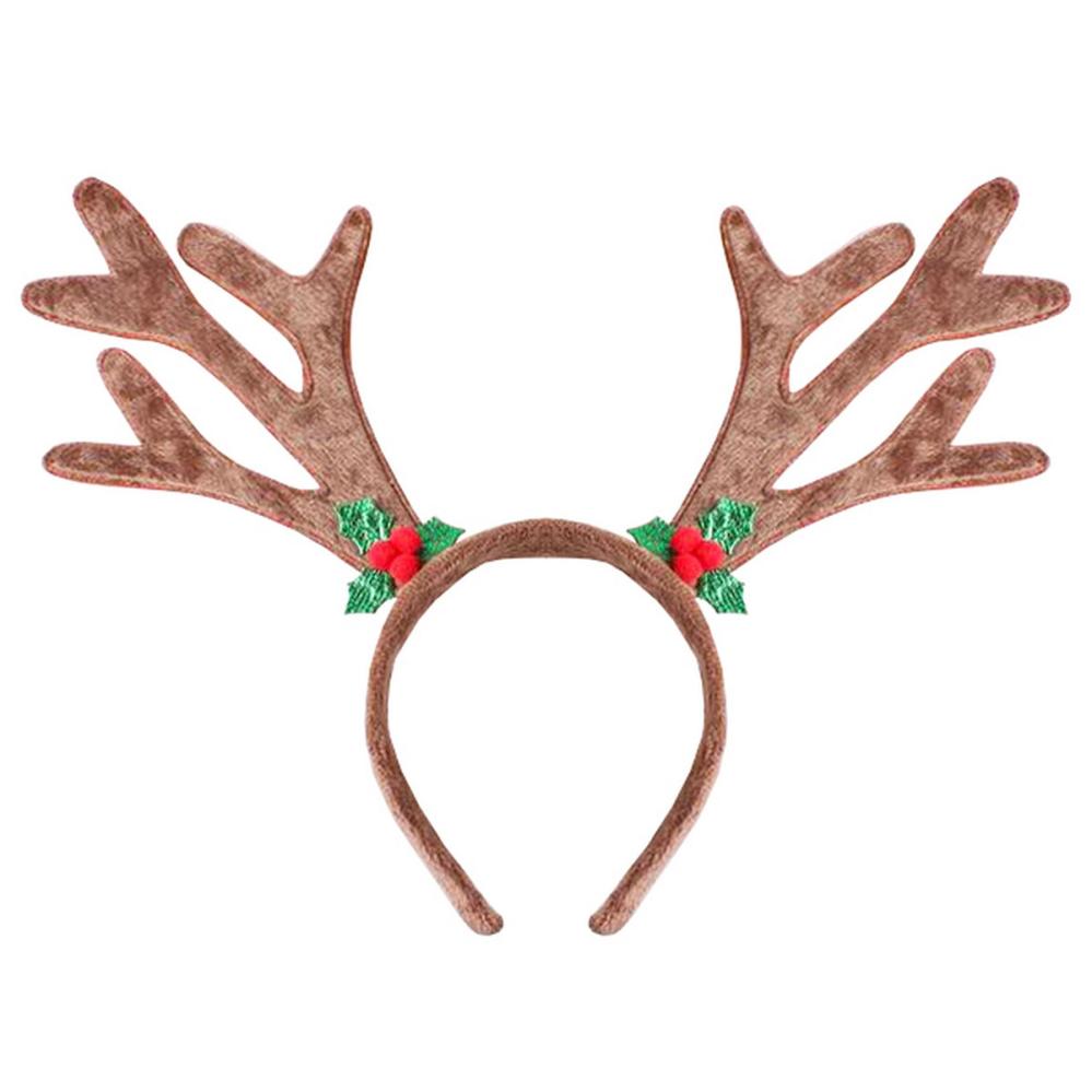 Julehårbøyle med Reinsdyrhorn Lysebrunt omfatter en lysebrun hårbøyle med kristtorn og oppstående reinsdyrhorn.