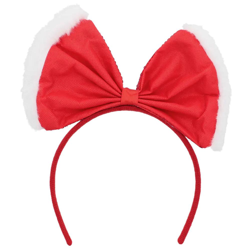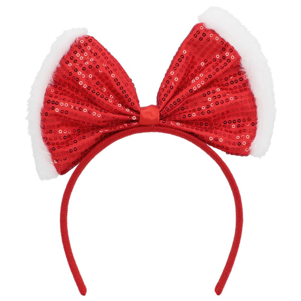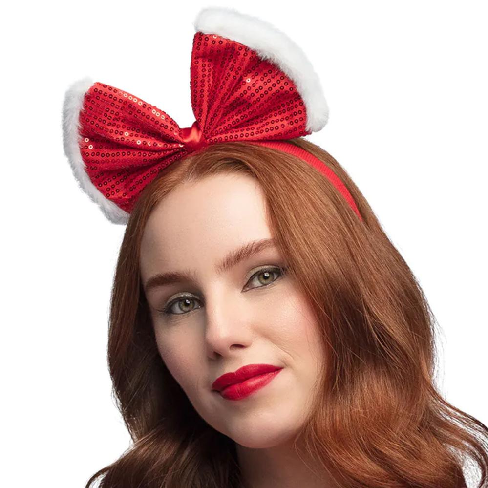 Julehårbøyle med Rosett Rød omfatter en rød hårbøyle med en oppstikkende rød rosett med røde paljetter og hvit pelskant.