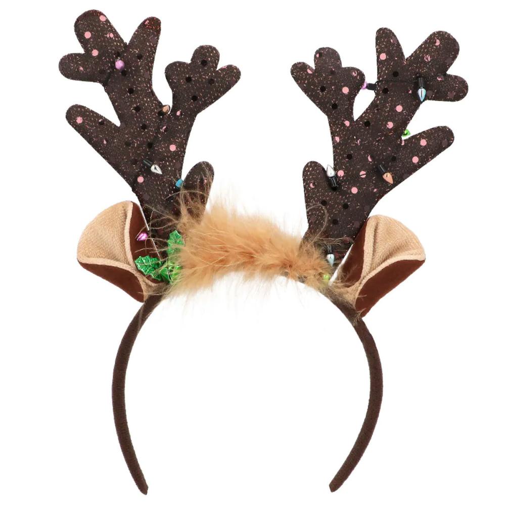 Julehårbøyle Reinsdyrhorn og Bjelle omfatter en brun hårbøyle med oppstående reinsdyrhorn, dekorert med en grønn bjelle, fjær i beige og en falsk lyslenke med flerfargede LED-lys.