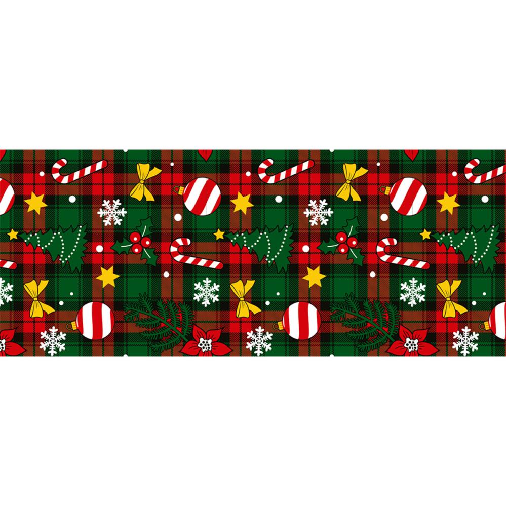 Juleløper med Rutemønster er en bordløper med et klassisk rutete mønster i rødt og grønt, dekorert med sjarmerende julemotiver som f.eks. julekuler, juletrær, polkastenger og snøfnugg.