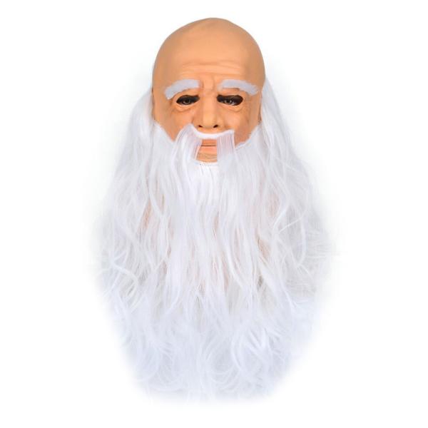 Julenisse Maske Latex omfatter en realistisk nissemaske for voksne med langt krøllete skjegg, øyenbryn og hår i hvitt. Masken dekker hele hodet og har hull for øyne, nese og munn. Nissemasken er laget av latex og polyester.